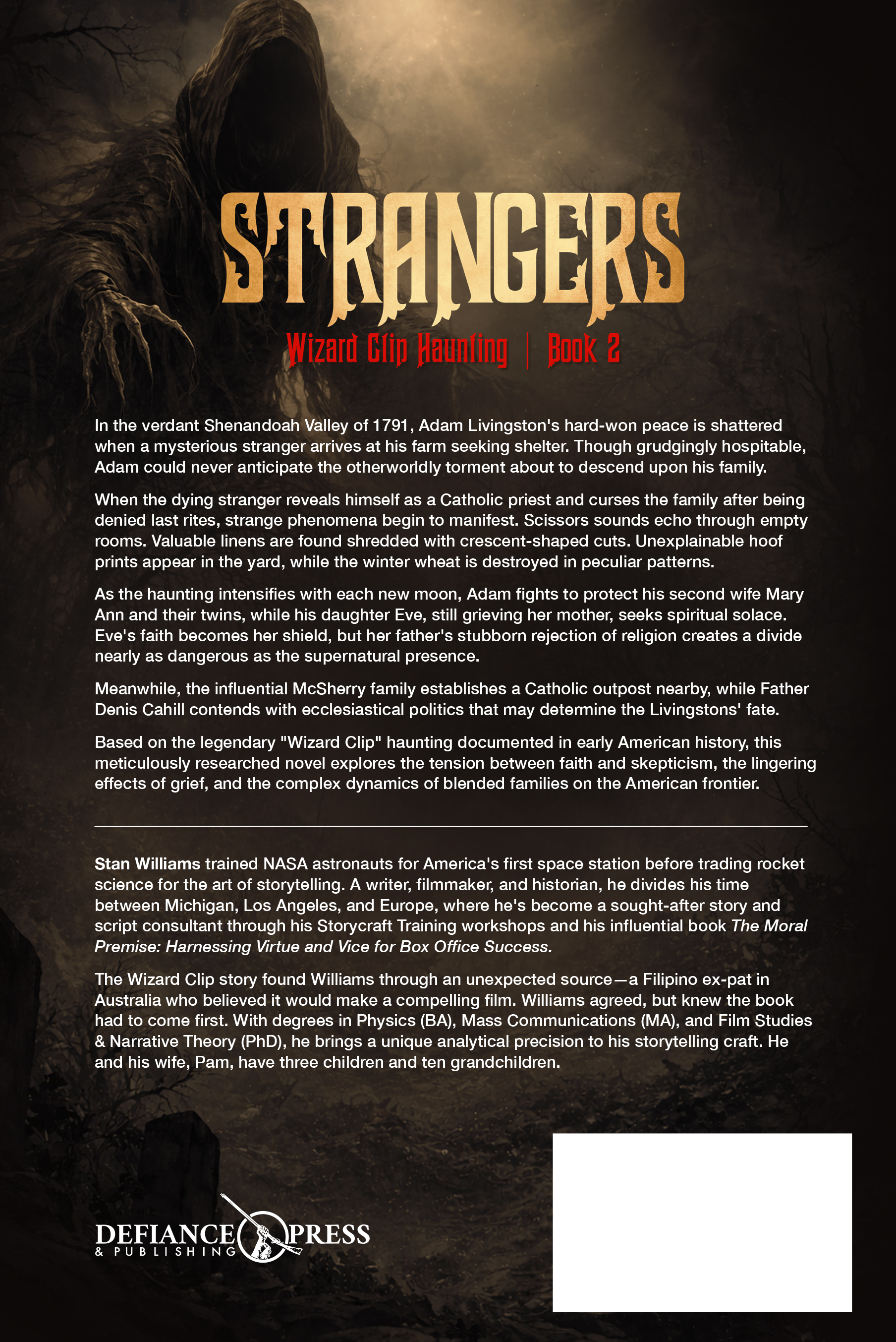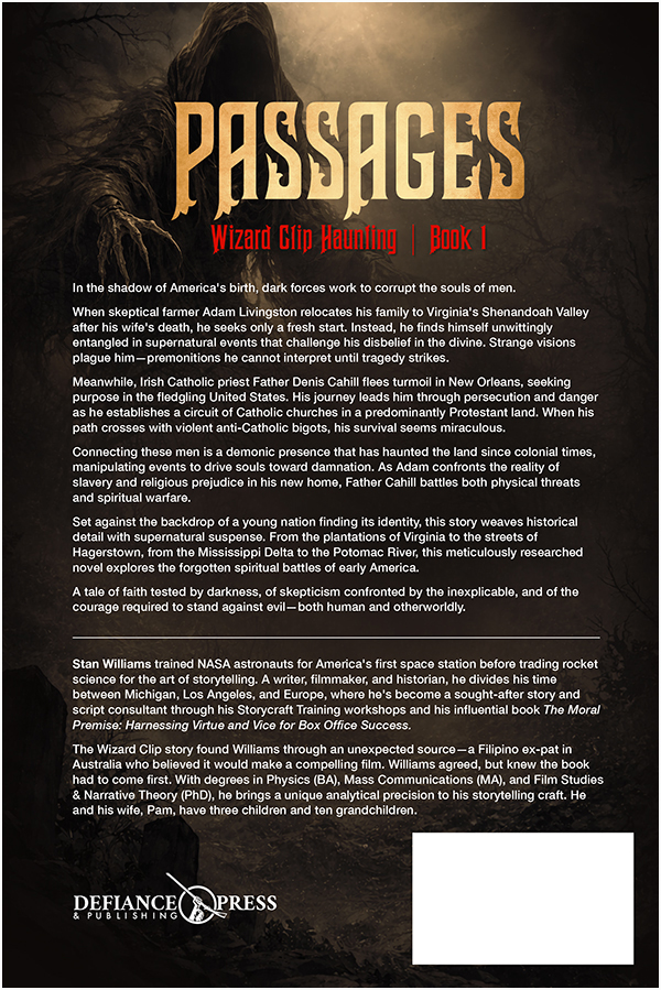 With The Wizard Clip Haunting Stan Williams has blended history, legend, myth, and mystery into a gripping fictional tale of human (and other-world persons) battles for the lives and souls of a collection of real-life late eighteen century settlers and pioneers in the Virginia of an emerging United States of America. The author's experience as a Hollywood script writer and movie consultant is evident in his skillful portrayals of the cast of characters whom he brings to life - and for some - to death in a whodonit, or rather a who-is-doing-it plot which culminates in both an explosive and unexpected conclusion. It is a huge read in more ways than one, and if Dr Williams can fashion a script out of it we can expect a blockbuster of note. Mike Mahony, South Africa.